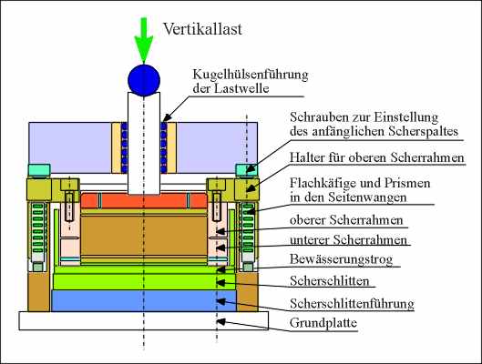 Bei herkömmlichen Schergeräten (DIN 18137 bis September 2002) treten während des Schervorganges vertikale Kräfte am oberen Scherrahmen auf (Reibschluß bei Auflockerung oder Verdichtung der Probe). Dadurch werden je nach Verhalten der Probe zu hohe oder zu niedrige Werte für die Scherspannungen ermittelt und damit die Schergerade verfälscht (siehe Lindemann, GEOTECHNIK Heft 1/2003, S. 27).Die Fehler durch Kraftnebenschluß lassen sich vermeiden, indem der obere Scherrahmen vertikal frei beweglich gehalten und gleichzeitig mit einer Momentenstütze für das beim Abschervorgang auftretende Kippmoment versehen wird.